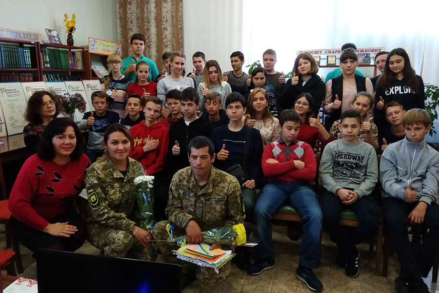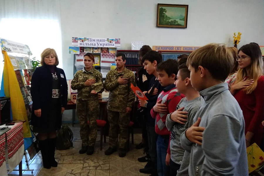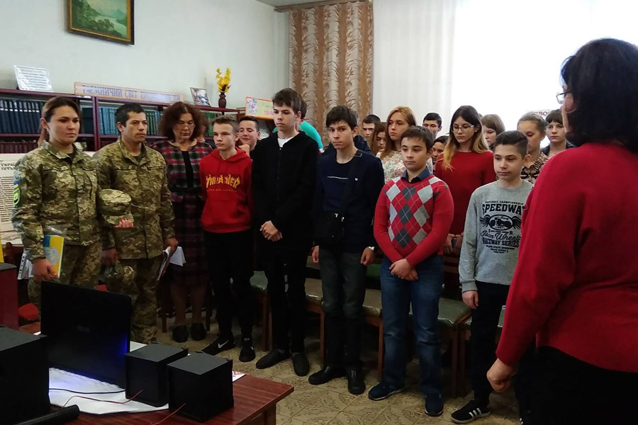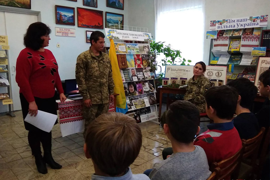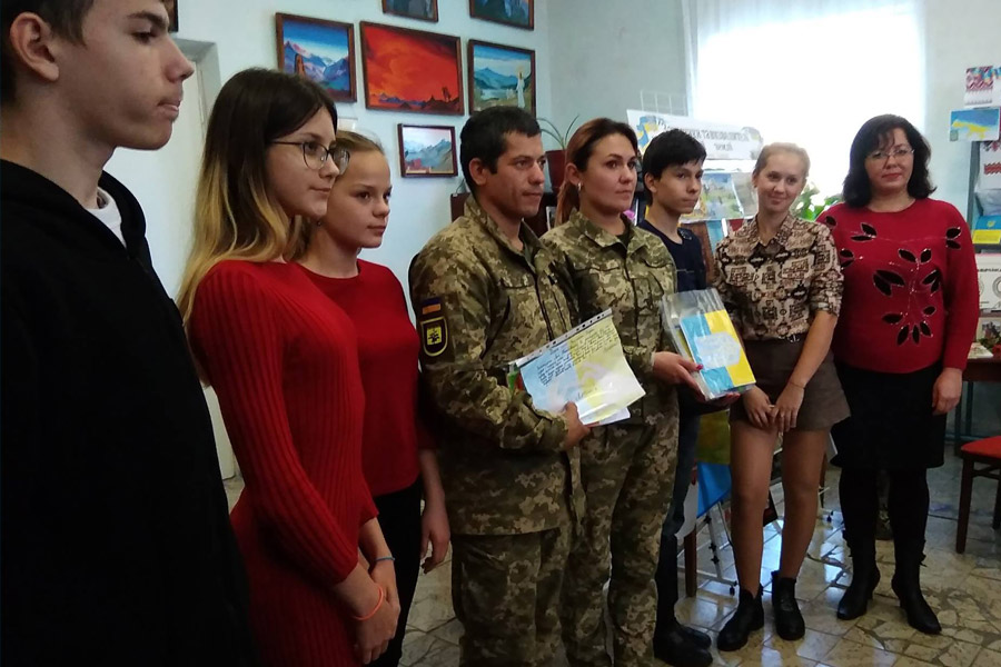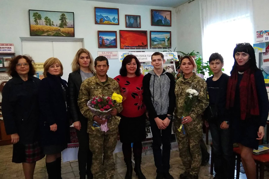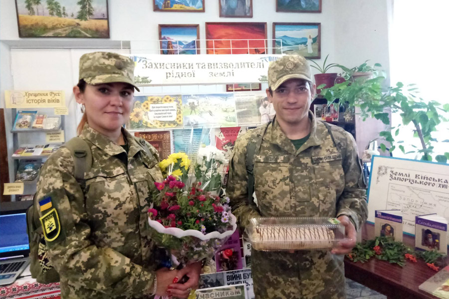 Почесними гостями бібліотеки цього дня були військовослужбовці Покровсько-Ясинуватського ОМВК старший солдат Ольга Олександрівна Загнойко та солдат Юрій Олексійович Пашков.