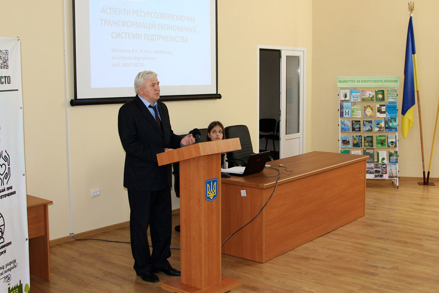 Від імені викладацького колективу вишу виступив професор, доктор технічних наук Віктор Костенко з доповіддю «Аспекти ресурсозберігаючих трансформацій економічної системи підприємства».