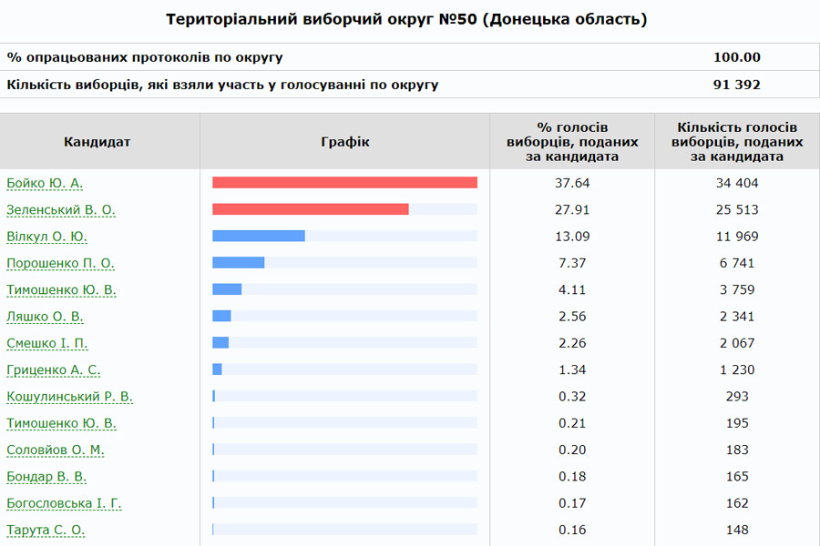 За результатами голосування лідером є Юрій Бойко з 37,64% голосів виборців. На другому місці Володимир Зеленський. За нього віддали свої голоси 27,91% виборців.