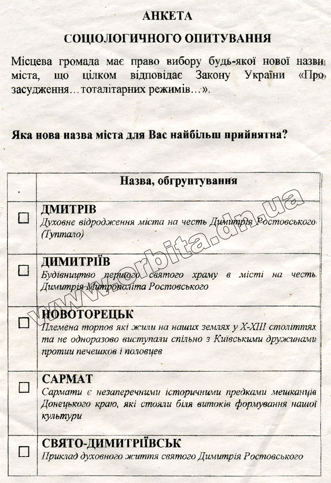 Стоит отметить, что в Димитрове уже проводится анкетирование для определения будущего названия города. По итогам серьезной подготовительной работы на суд общественности было вынесено пять наименований, среди которых варианта «Стусово» нет. Горожане могут выбирать из названий Дмитров, Димитриев, Новоторецк, Сармат и Свято-Димитриевск.