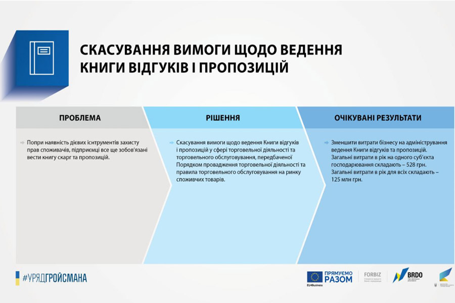 Крім цього, Уряд за ініціативою Мінекономрозвитку скасував норму обов’язкового ведення книги відгуків і пропозицій.