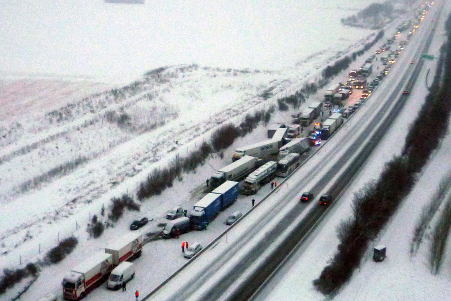 В полиции сообщают, что из примерно 100 транспортных средств, попавших в аварию, 40 – грузовики, а остальные – легковые автомобили.