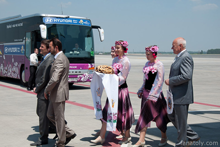 На аэродроме футболистов встречали представители власти Донецкой области, включая главу Донецкой облгосадминистрации Андрея Шишацкого и председателя Донецкого облсовета Андрея Федорука. Также, по уже сложившейся традиции, гостей встретили караваем.