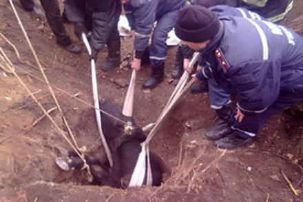 Спасатели с помощью пожарных рукавов вытащили бедное животное из колодца на поверхность.