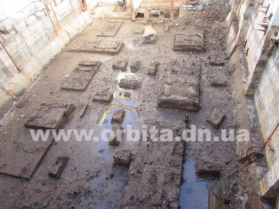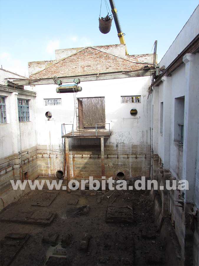 С использованием крана завершается уборка машинного зала, намечено расположение отдельных зон внутри помещения, в стенах пробиты дополнительные проемы для нового оборудования, меньшего по размерам, чем предыдущее.