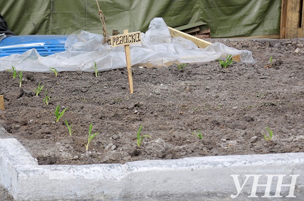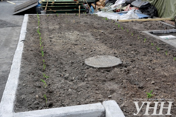 Местные аграрии уже обработали грядки у одной из палаток неподалеку от выхода из метрополитена на улице Крещатик. Там они высадили, салат, лук, редис, укроп и петрушку.