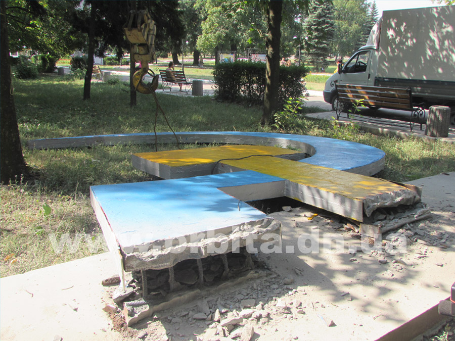 Сегодня работники КП «Управление городского хозяйства» приступили к демонтажу знака «Серп и молот» на бульваре Андрющенко в Красноармейске.