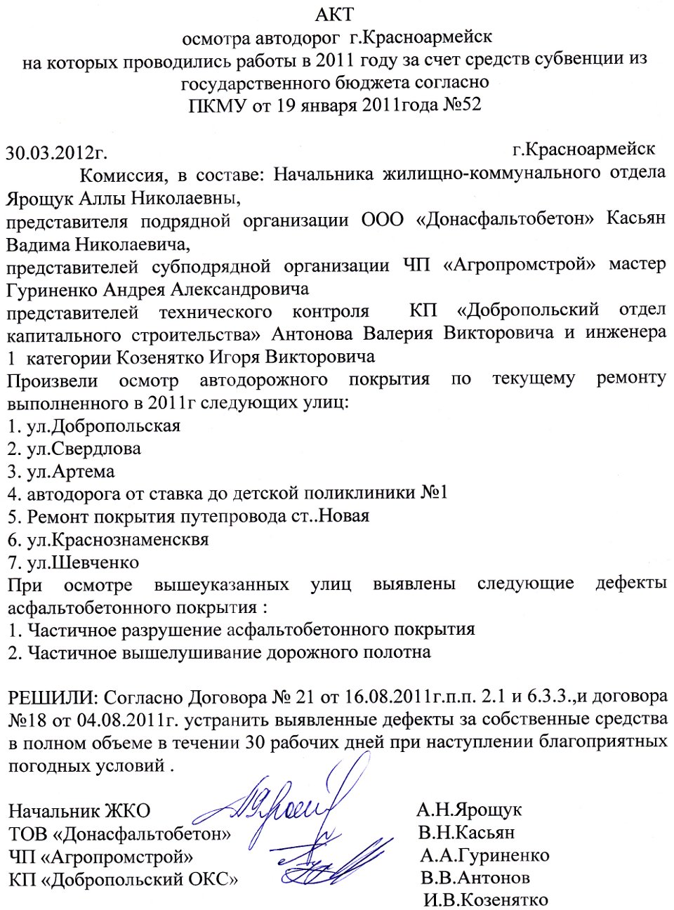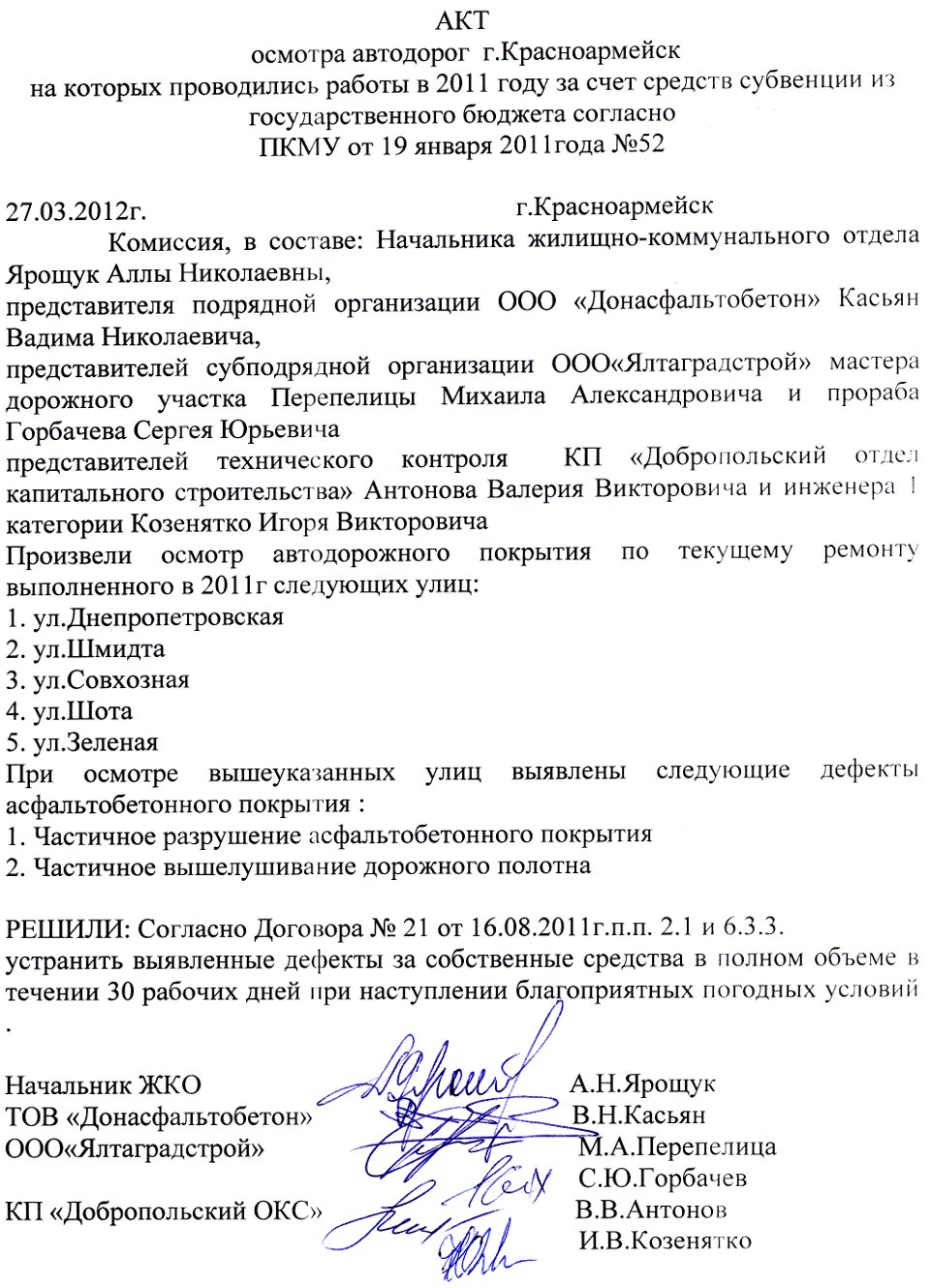 Конец 2011 года в нашем городе ознаменовался долгожданным ремонтом дорог. Правда, тогда работы велись при не очень благоприятных погодных условиях, но ремонтники гарантировали – дороги продержатся 12 месяцев. Однако уже сегодня проезжие части снова в ямах и выбоинах. Авторитетная комиссия составила дефектный акт, и подрядная организация, которая выполняла ремонт, за свой счет в течение месяца должна исправить ситуацию.