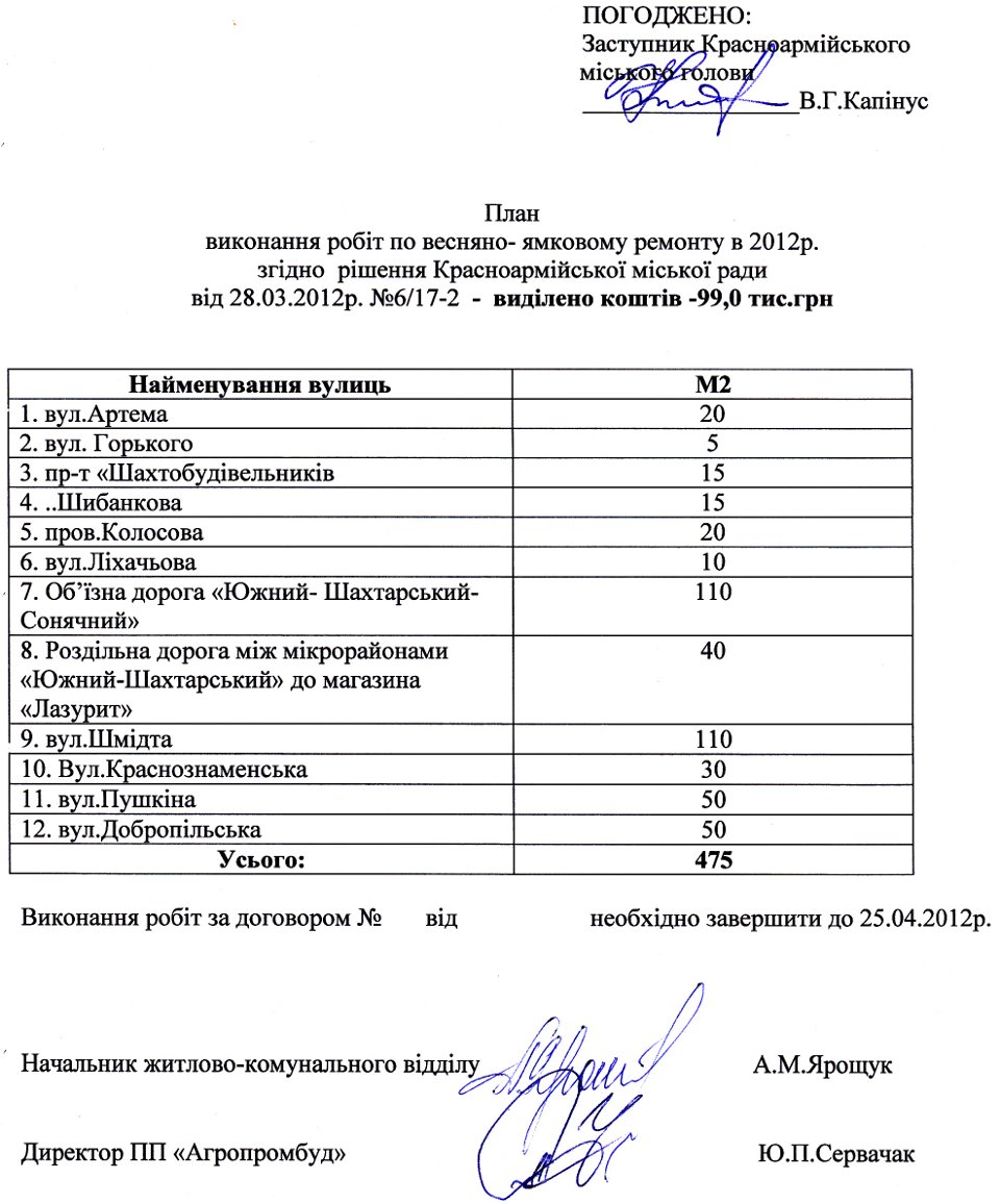 На ремонт самых проблемных участков выделил средства и город. За 99 тысяч гривен планируют привести в порядок проспект Шахтостроителей, объездную дорогу в микрорайонах «Южный», «Шахтерский» и «Солнечный», а также улицы Артема, Шмидта, Горького, Лихачева, Константиновскую и Пушкина. Кстати, на последней уже сегодня работает фреза. Все работы планируют завершить до 25 апреля. Кроме того, на 2012 год запланировано проведение и капитального ремонта автодорог. Однако из-за тендерных процедур, деньги из государственного бюджета поступят не раньше октября.