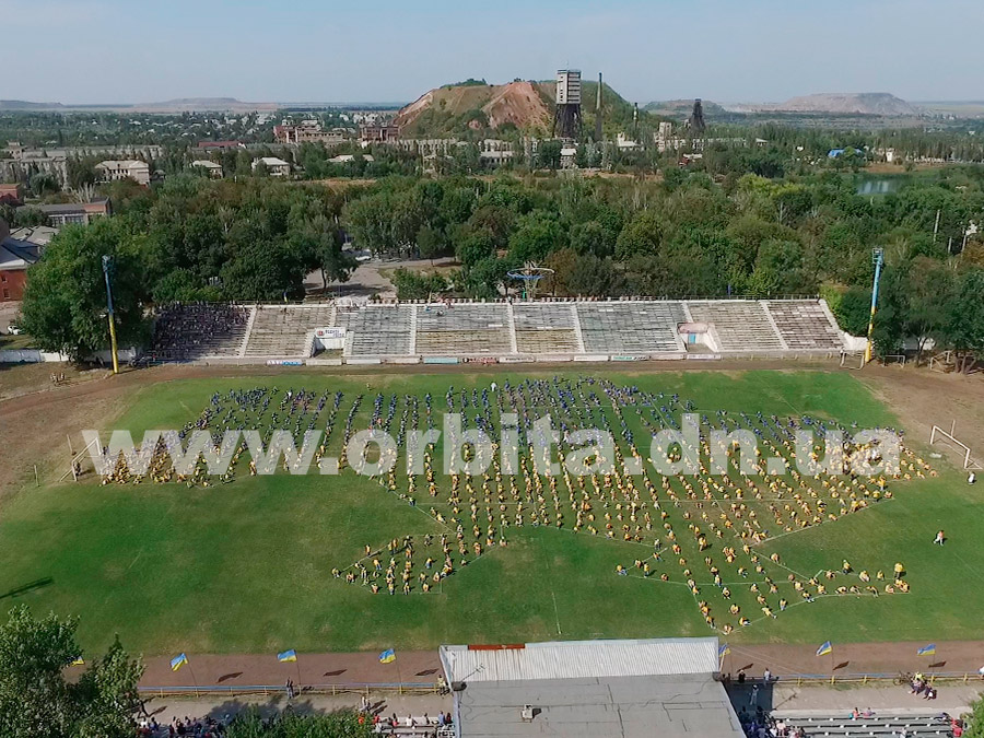 Сегодня на стадионе «Шахтер» в городе Мирнограде был зафиксирован национальный рекорд. 1475 детей, одетых в синие и желтые футболки, выстроились в виде карты Украины.