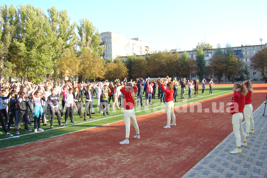 Общешкольная зарядка собрала на стадионе учебного заведения почти тысячу учащихся со своими кураторами. Примечательно, что этот стадион является самым большим (40 на 60 метров) в Донецкой области полем с искусственным покрытием.