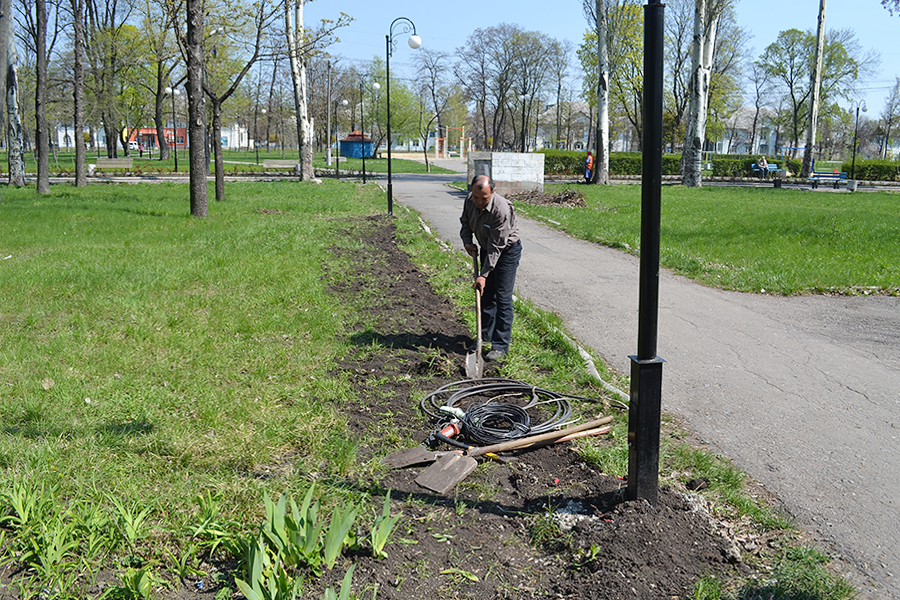 В парке динасового завода в Покровске сотрудники Управления городского хозяйства меняют подземную линию, снабжающую электричеством уличные фонари. Старая пришла в негодность – так объяснил журналистам электромонтер, который выполнял эти работы.