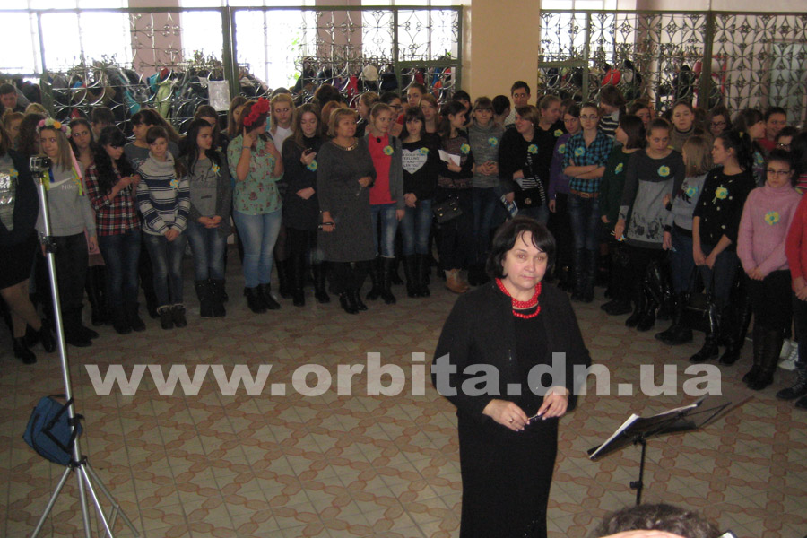 К действу приобщились учащиеся общеобразовательных школ Покровска и студенты педучилища вместе с преподавателями. Каждый из участников флешмоба получил желто-синий цветок, после чего все вместе исполнили песню «Ой, у лузі червона калина».