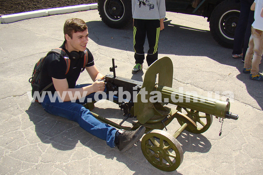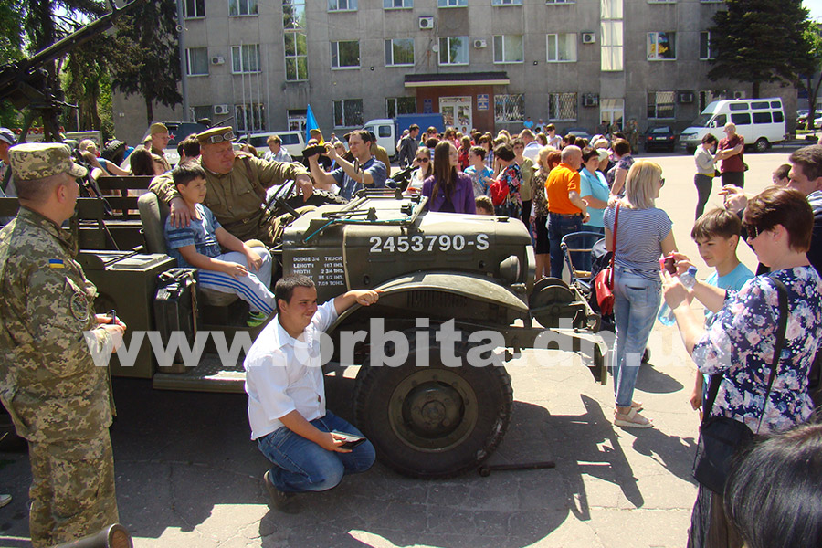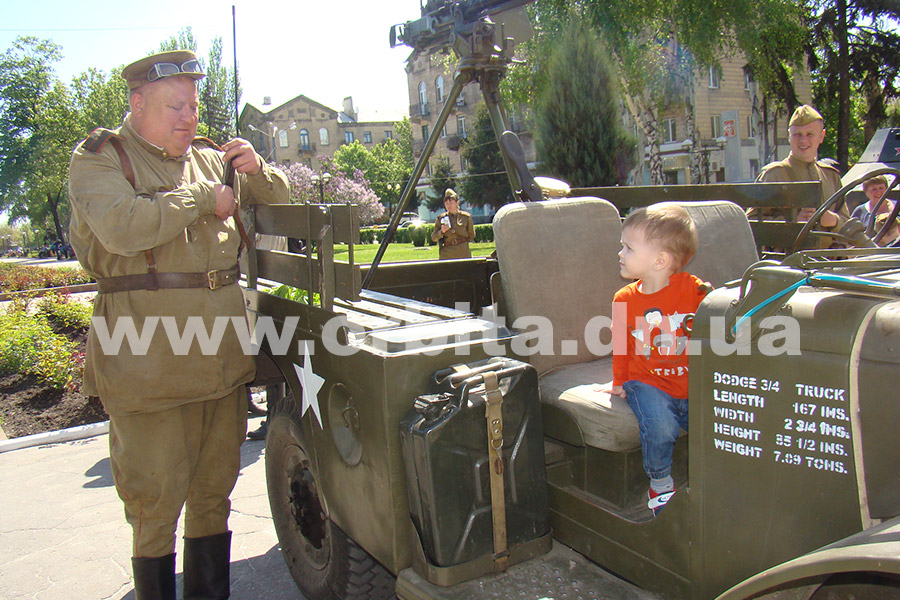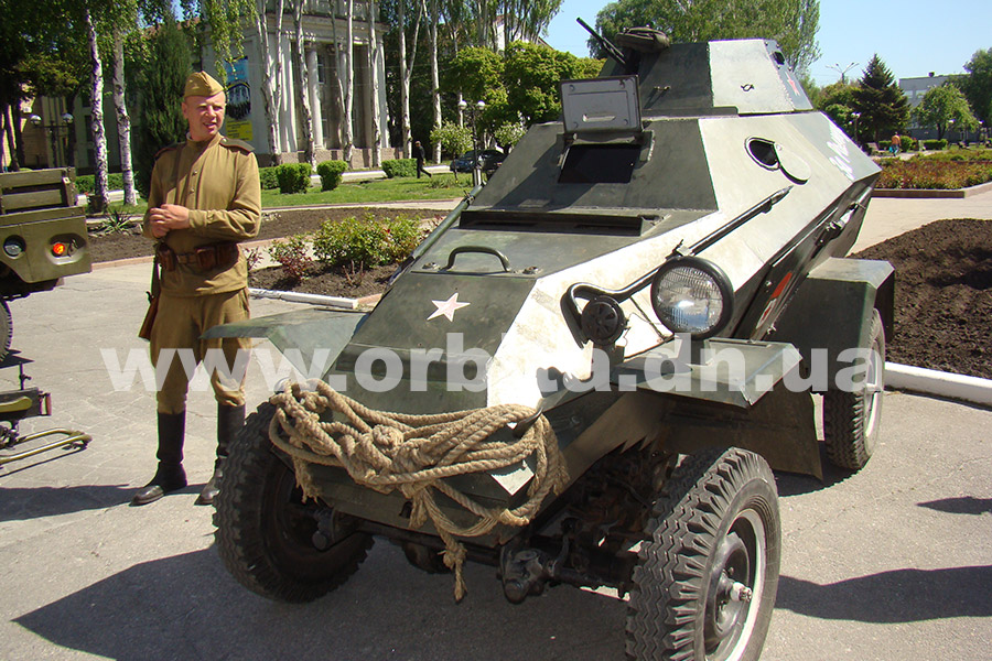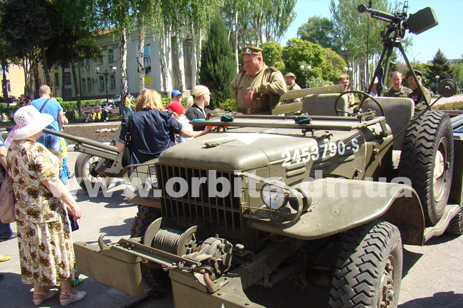 На площади Шибанкова жители и гости Покровска смогли увидеть отреставрированную технику, прошедшую по дорогам Второй мировой, а также стрелковое и колющее оружие. На выставке были представлены два мотоцикла М-72 выпуска 1943 года, грузовик ГАЗ-63, внедорожник «Volkswagen Kubelwagen», принимавший участие во взятии Берлина, пулемет «Максим».