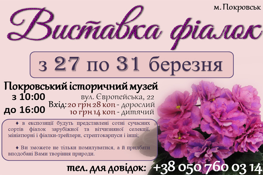 С 27 по 31 марта в Покровском историческом музее будет проходить выставка фиалок, которую привезет в наш город Краматорский клуб «Фиалочка». Об этом телекомпании «Орбита» сообщили в музее.