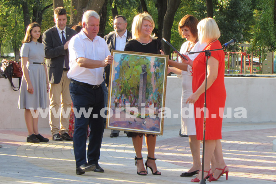 Руководитель отдела культуры Тульчинского городского совета Екатерина Третьякова передала Покровску картину художницы из Тульчина и приветственный адрес от городского головы и депутатского корпуса.