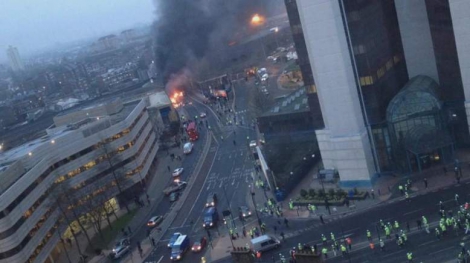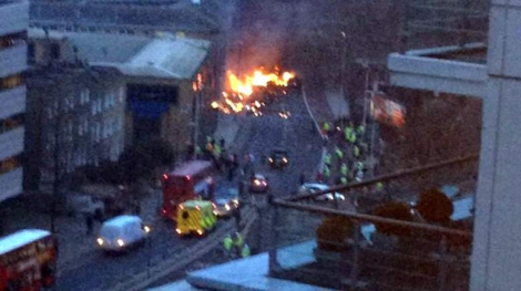 В центре Лондона вертолет врезался в строительный кран на южном берегу реки Темзы, упал на землю и загорелся.