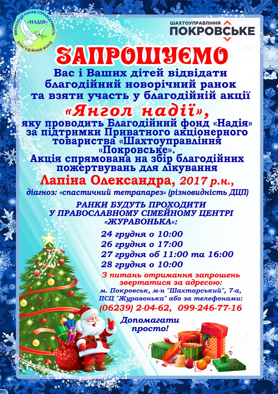 У рамках благодійної акції «Янгол надії» Благодійний фонд «Надія» за підтримки Приватного акціонерного товариства «Шахтоуправління «Покровське» організовує проведення новорічних благодійних ранків для дітей від 1 до 7 років.