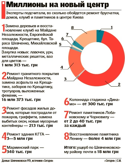 «Это огромный ущерб! И 20 млн — это только беглый осмотр зданий и парков. По Мариинскому (где стоит Антимайдан. — Авт.), нанесен ущерб в размере 340 тысяч гривен. Мы уже выставили счет. Деньги должны уплатить организаторы митинга. А вот по поводу Майдана и улицы Грушевского сказать точно не могу. Никто на себя пока не берет ответственность за проведение митингов и строительство баррикад из коммунального имущества — лавочек, заборов, ливневок», — рассказал «Сегодня» первый замглавы КГГА Анатолий Голубченко. Только зданию мэрии, по его словам, нанесен ущерб в размере 3—5 млн грн.