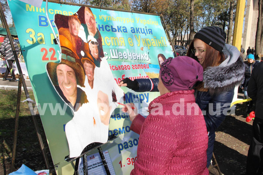 В поселке Шевченко продолжилась акция по созданию самой большой в Украине картины мира, инициатором которой выступила десятиклассница ОШ №2 города Покровска Лилия Дорошенко. Свой мазок кистью в рисунке на пазле, представляющем Донецкую область, сделали около 300 гостей праздника.