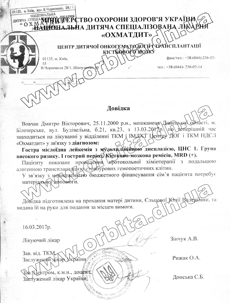 Сейчас ее сын проходит лечение в киевской НДСБ «ОХМАТДЕТ» с диагнозом острая миелоидная лейкемия с мультилинейной дисплазией, группа высокого риска.