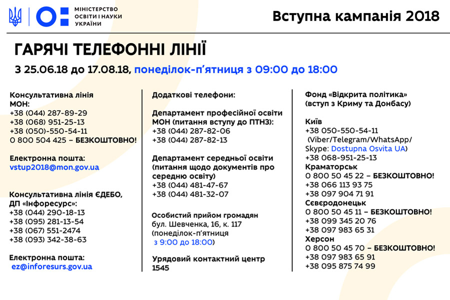 З понеділка, 25 червня 2018 року, в МОН відкрито гарячу лінію та приймальню громадян щодо вступної кампанії 2018. Вони працюватимуть до 17 серпня включно. Про це розповіла Міністр освіти і науки України Лілія Гриневич під час прес-конференції «Вступ-2018», що відбулася вчора, 25 червня, в МОН, інформує прес-служба МОН.