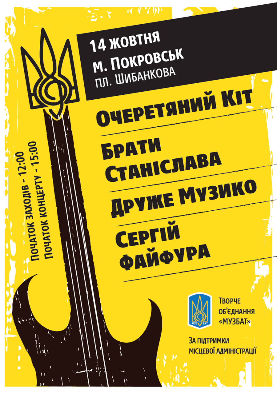 14 жовтня у Покровську в складі “Музичного Батальйону” можна буде почути запальних одеситів «Друже Музико», «Очеретяного кота» з Вінниці, Сергія Файфуру та драйвових франківців «Братів Станіслава».