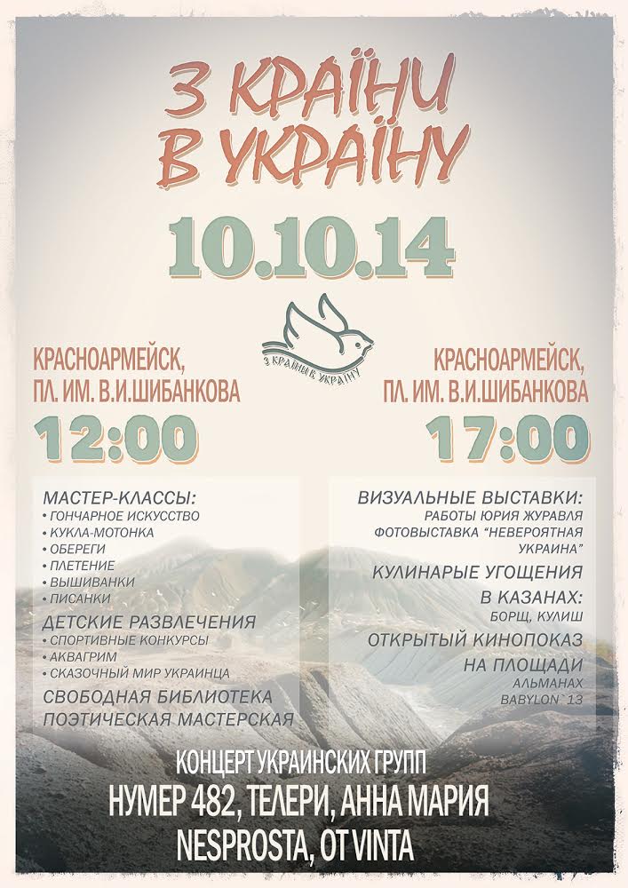 Завтра, 10 октября, в 12.00 в Красноармейске начнется фестиваль «Из страны в Украину». На площади Шибанкова жителей города ожидают разнообразные мастер-классы, фотовыставка, концерт украинских рок-групп и популярных исполнителей, кинопоказ, дегустация борща от славных мастеров из с.Сорочинцы и многое другое.