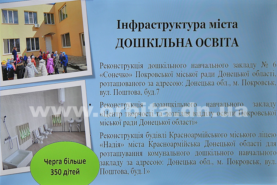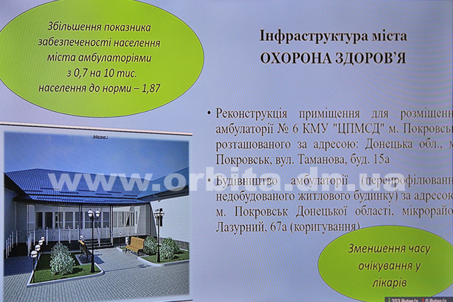 – реконструкция внешкольного учреждения «Центр творчества и досуга» отдела образования Покровского городского совета. Планируется достроить Г-образное здание по периметру с внутренней стороны, таким образом оно получит форму квадрата. В пристройке будет находиться зал хореографии, разместятся кабинеты для занятий, методкабинеты, буфет;