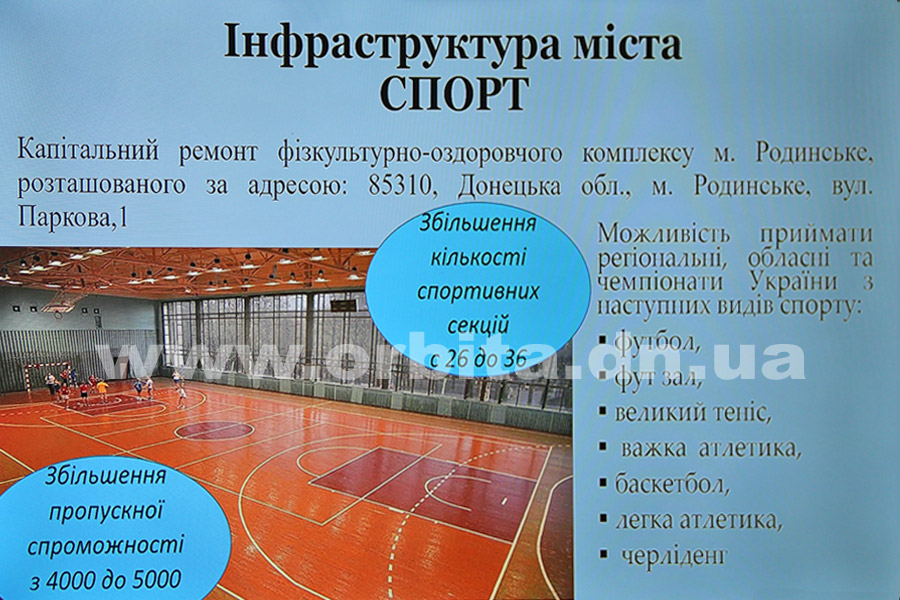 – капитальный ремонт спортивного сооружения Физкультурно-оздоровительного комплекса города Родинское, с последующей возможностью проводить на его базе соревнования по футболу, футзалу, большому теннису, тяжелой и легкой атлетике, баскетболу, черлидингу.