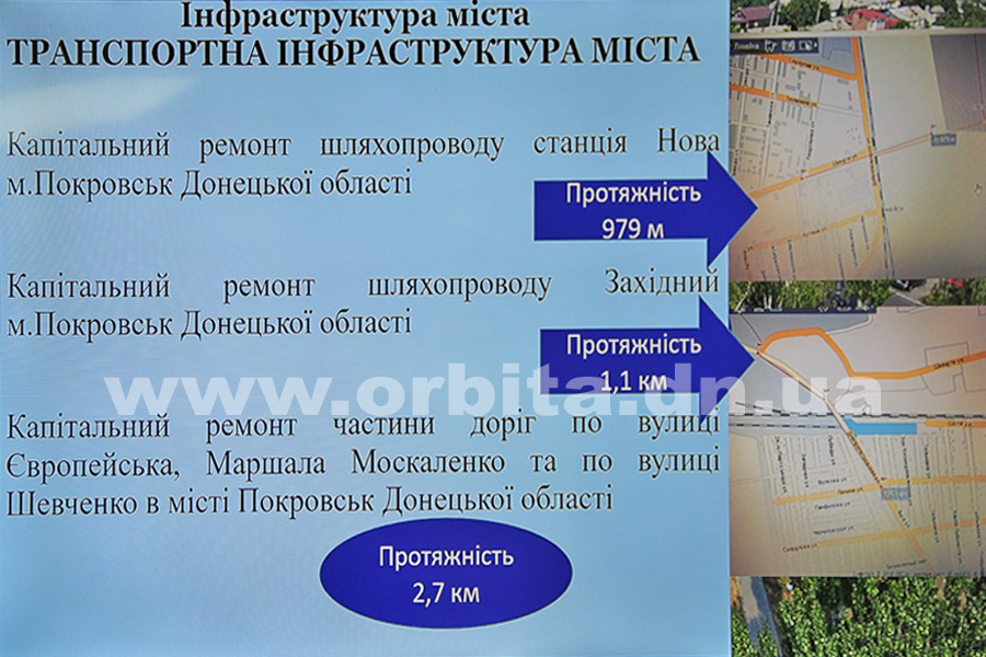 – капитальный ремонт части дорог центра Покровска: улиц Европейской, Шевченко и Маршала Москаленко (между Европейской и Шевченко). Общая протяженность участка – 2,7 километров;