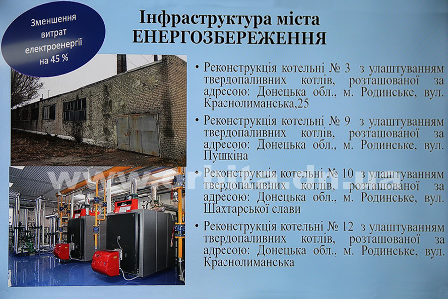 – реконструкция (с установкой твердотопливных котлов) четырех коммунальных котельных города Родинского: №3 (ул. Краснолиманская), №9 (ул. Пушкина), №10 (ул. Шахтерской Славы) и №12 (ул. Краснолиманская).