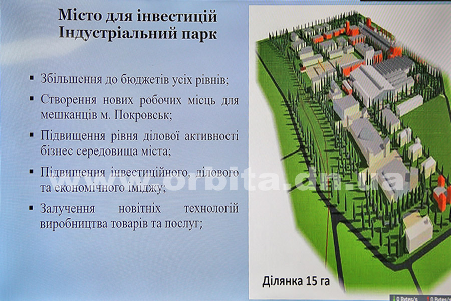 – создание «города для инвестиций» – Технопарка на земельном участке площадью 15 квадратных километров, расположенном на восточной окраине Покровска. Целью проекта является создание новых рабочих мест, увеличение поступлений в бюджеты всех уровней, повышение уровня активности бизнес-среды города, рост инвестиционного, делового и экономического имиджа, привлечение новейших технологий производства товаров и услуг.