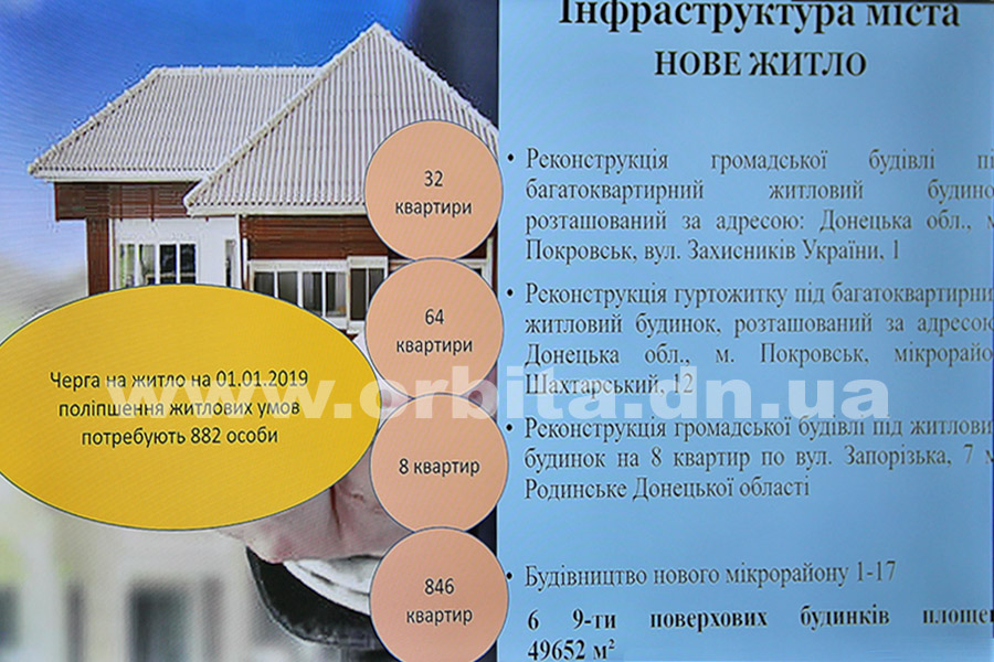 – строительство нового жилого микрорайона «1-17» на окраине Покровска, за микрорайонами «Лазурный» и «Солнечный». Здесь планируется построить шесть девятиэтажных домов общей площадью 49,562 квадратных метров, предварительно рассчитанных на 846 квартир. Помимо жилых домов, инвестор будет обязан построить в новом микрорайоне детский сад.