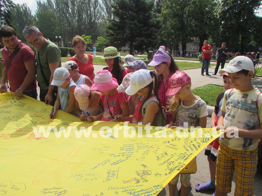 Сегодня эстафету перенял Красноармейск. Все желающие пришли на площадь Шибанкова, чтобы оставить собственные пожелания на сине-желтом полотне.