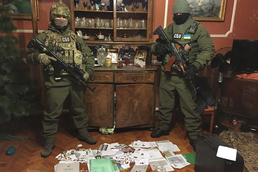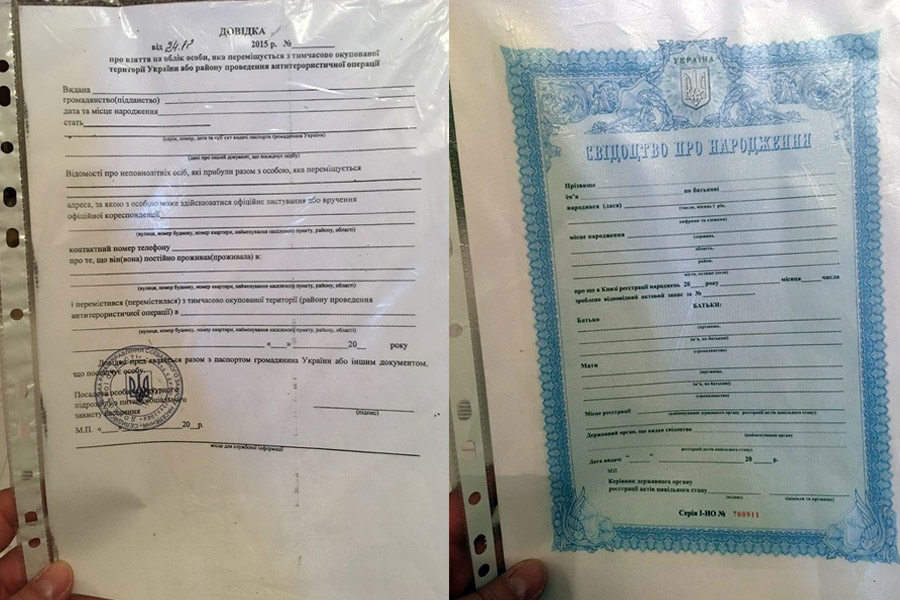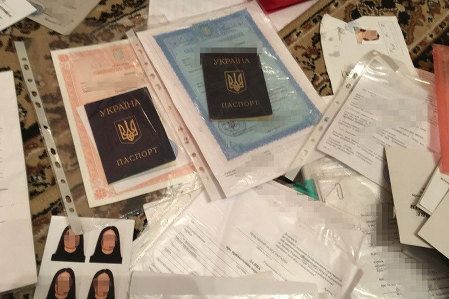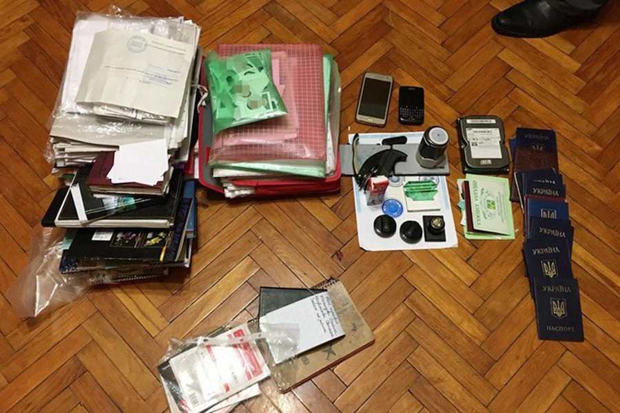 Во время обыска в доме задержанной оперативники спецслужбы обнаружили 16 паспортов граждан Украины с признаками подделки; устройство для изготовления гербового оттиска на фотографиях в паспортах; незаполненные бланки с гербовыми печатями справок о регистрации временно перемещенных лиц, свидетельства о рождении, бланки заявлений о потере или хищении паспорта, о назначении всех видов социальных платежей; 40 готовых справок временно перемещенных лиц и 60 комплектов фотографий для вклеивания в документы.